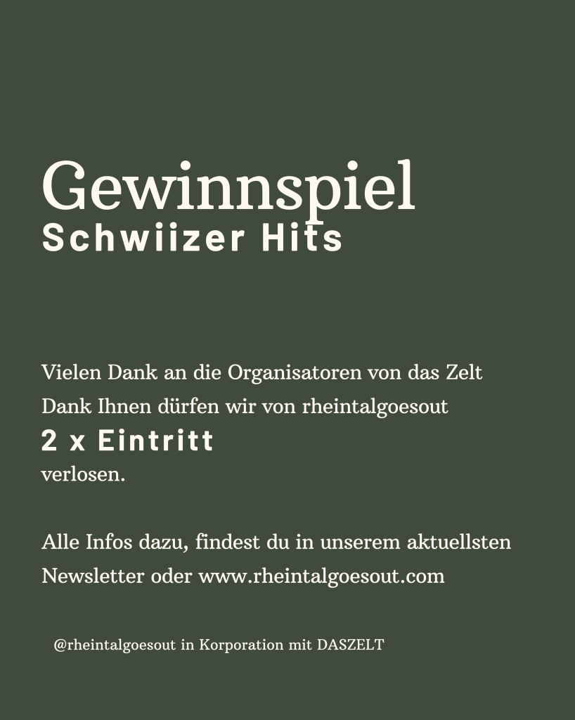 Tickets können über Ticketcorner erworben werden – aber auch wir von rheintalgoesout haben zwei Tickets von “das Zelt” gesponsert bekommen und dürfen diese für den Event “Schwiizer Hits” am 25. Oktober 2025 verlosen.