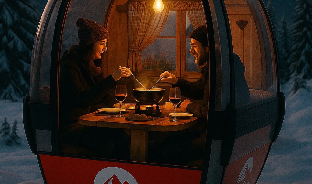 – Kommentiere unter dem Beitrag, mit wem du im warmen Gondeli ein Käsefondue geniessen möchtest